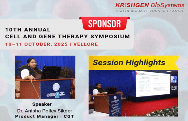 (inner section) Krishgen Biosystems showcased its latest innovation at the CGT Conference in Vellore — a Cross-Matrix Validated Human Cytokine ELISA. This advanced immunoassay demonstrates precise and reliable cytokine detection across both serum and cerebrospinal fluid (CSF) matrices, ensuring higher accuracy in translational and neuroinflammatory research. The presentation highlighted Krishgen’s continued commitment to developing robust, application-driven ELISA solutions that empower researchers to generate reproducible results across complex biological samples.
