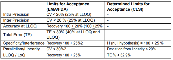 Determined Limits for Acceptance according to EMA/FDA and CLSI regulations