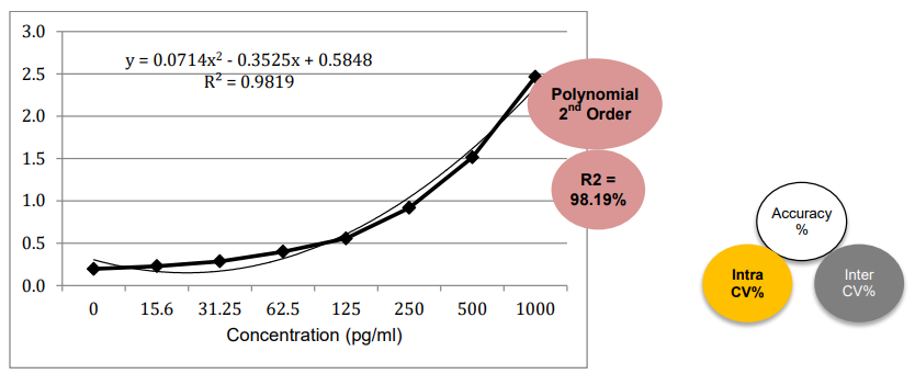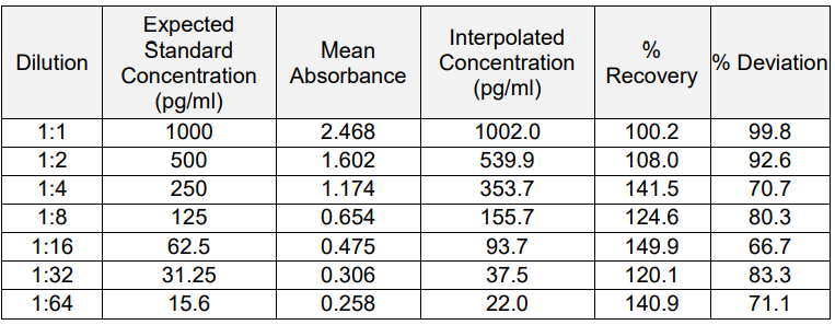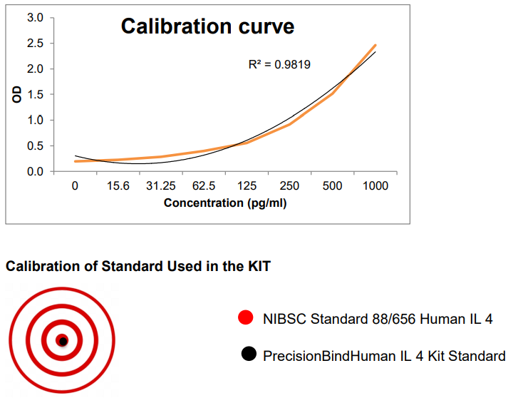 The PrecisionBind Human IL 4 ELISA kit is developed using an assay range of 15.6 – 1000 pg/ml with the dilutional linearity accuracy to measure responses as per the application table above on patient Cmax values. The kit has also been validated upto 16 fold dilution
