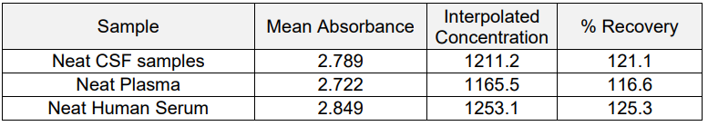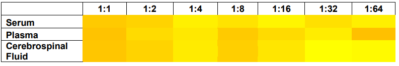Sample Dilution factor – Human Serum, Human Plasma and Human CSF samples have been tested. Neat samples can be run directly.